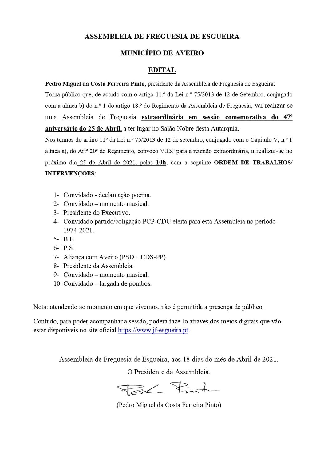 Decorre no próximo dia 25 de Abril 2021 uma Assembleia de Freguesia extraordinária em sessão comemorativa do 47º aniversário do 25 de Abril, que irá ter lugar no Salão nobre da Freguesia de Esgueira.