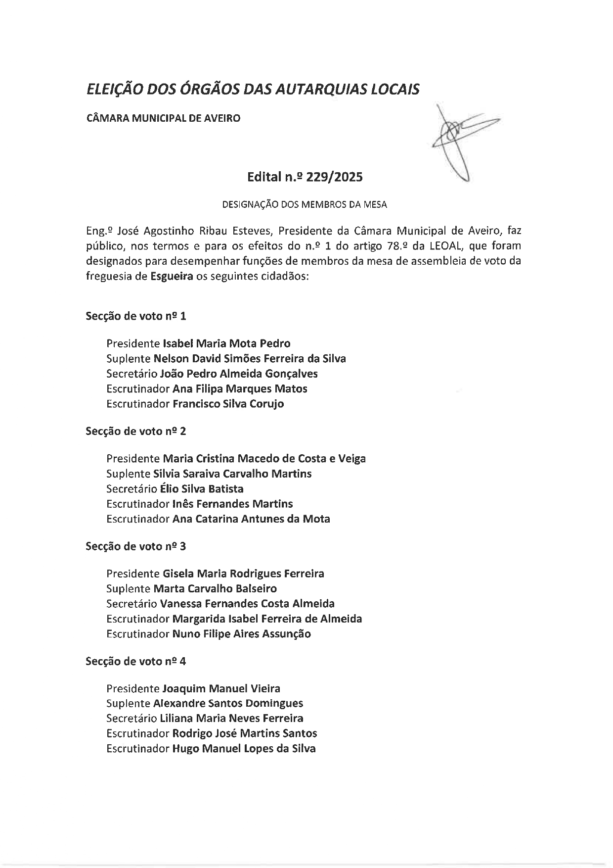 Eleição dos Órgãos das Autarquias Locais – Edital de Designação dos Membros de Mesa em Esgueira