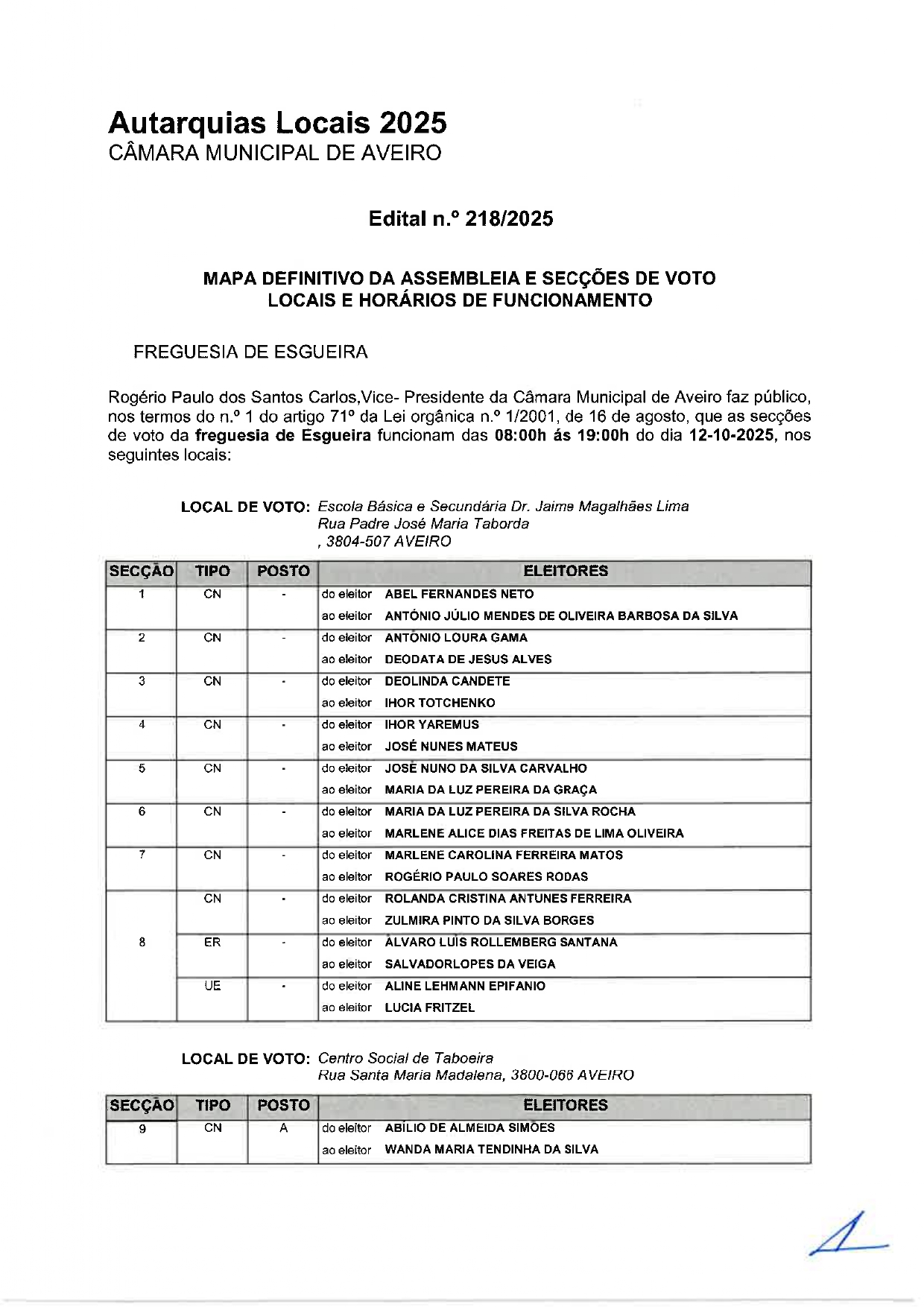 Mapa definitivo da Assembleia e Secções de Voto – locais e horários de funcionamento para a Freguesia de Esgueira.