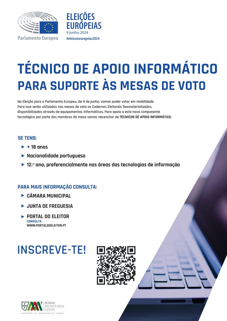 Na Eleição para o Parlamento Europeu, de 9 de junho, vamos poder votar em mobilidade. Para isso serão utilizados nas mesas de voto os Cadernos Eleitorais Desmaterializados, disponibilizados através de equipamentos informáticos. Para apoio a esta nova componente tecnológica por parte dos membros da mesa, vamos necessitar de Técnicos de Apoio Informático (TAI), que serão devidamente credenciados pela Administração Eleitoral.